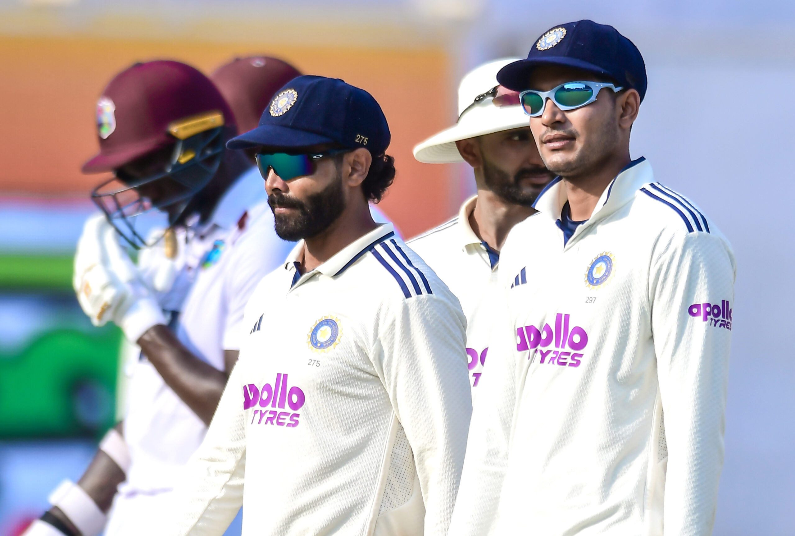 New Delhi: India’s Ravindra Jadeja bowls during the fourth day of the second and final Test cricket match between India and West Indies at the Arun Jaitley Stadium, in New Delhi on Monday, October 13, 2025. (Photo: IANS/Qamar Sibtain)